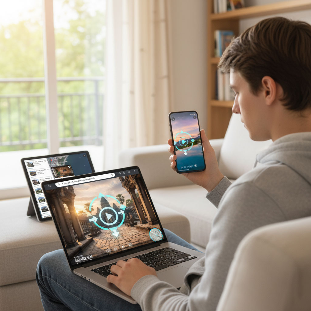 5. Tiếp Cận Không Giới Hạn, Phá Vỡ Rào Cản Địa Lý Tour 360 cho phép khách hàng từ mọi nơi trên thế giới truy cập và trải nghiệm không gian của bạn một cách trực quan. Một nhà đầu tư ở nước ngoài có thể "đi xem" một bất động sản, một du khách quốc tế có thể "dạo quanh" một resort trước khi đặt phòng. Công nghệ này tương thích với mọi thiết bị từ máy tính đến điện thoại thông minh, giúp bạn mở rộng thị trường và tiếp cận khách hàng tiềm năng ở xa một cách dễ dàng.